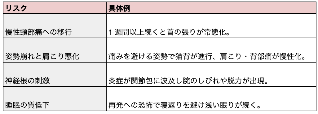 枕や姿勢、首肩の筋力バランスを整えないまま放置すると繰り返す可能性が高まります。予防エクササイズと生活環境の改善で再発リスクは大幅に下げられます。